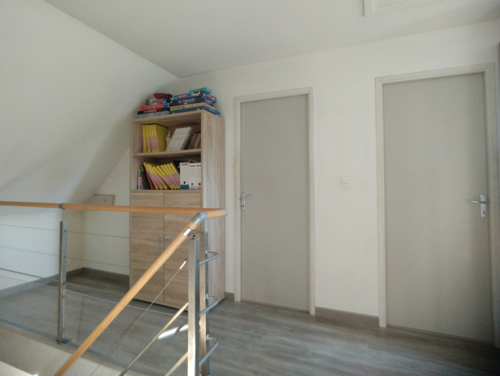 A l'étage, la mezzanine est occupée par un espace bureau et un pallier permettant d'envisager de nouveaux rangements. Elle dessert trois chambres confortables, un cabinet de wc et une salle de bain.
